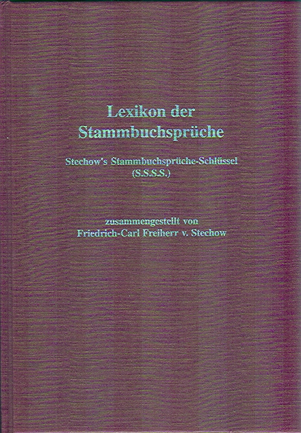AUTOR: Stechow, Friedrich-Carl Frhr. v. TITEL: Lexikon der Stammbuchsprüche; Stechow's Stammbuchsprüche-Schlüssel (S.S.S.S.); 1996. XIV u. 286 S., 5 Abb., Festeinband ISBN: 3-7686-1054-3